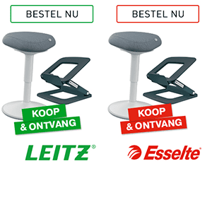 Bij een besteding van €60 incl. btw aan Leitz of Esselte producten ontvang je een gratis Leitz Ergo Verstelbare Multi-hoek Laptopstandaard (t.w.v. €35). Bij een besteding van €150 incl. btw aan Leitz of Esselte producten ontvang je een gratis Leitz Ergo Zit-sta Wiebelkruk (t.w.v. €159).